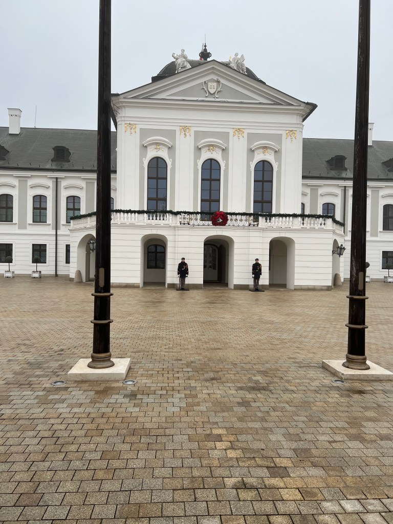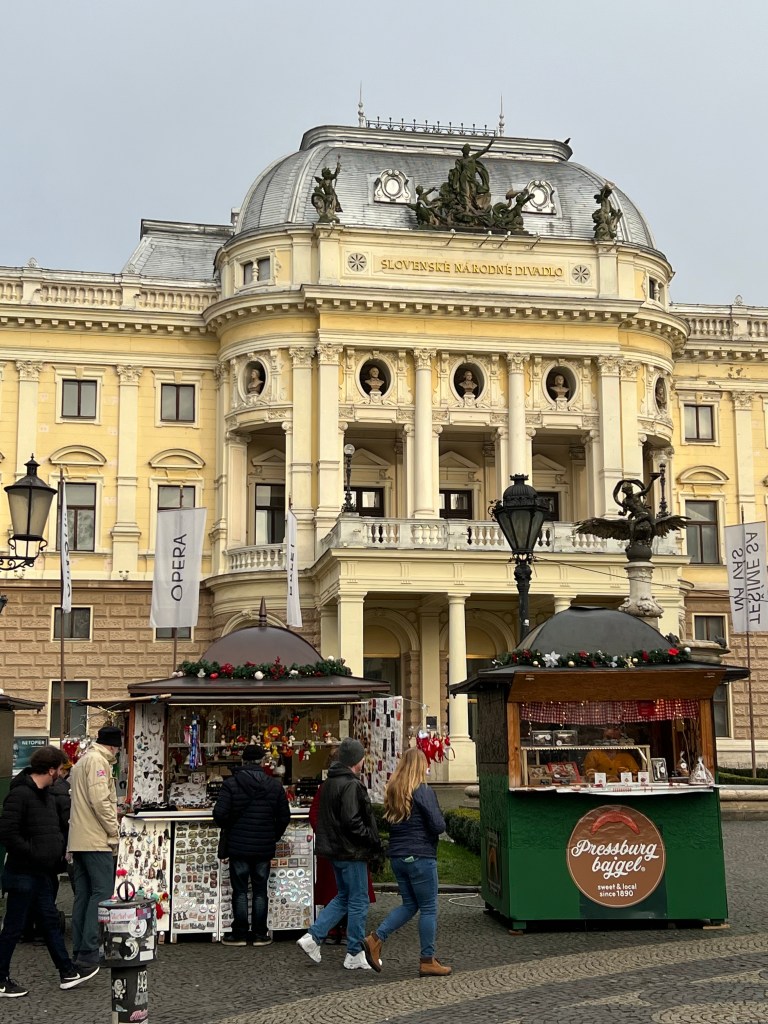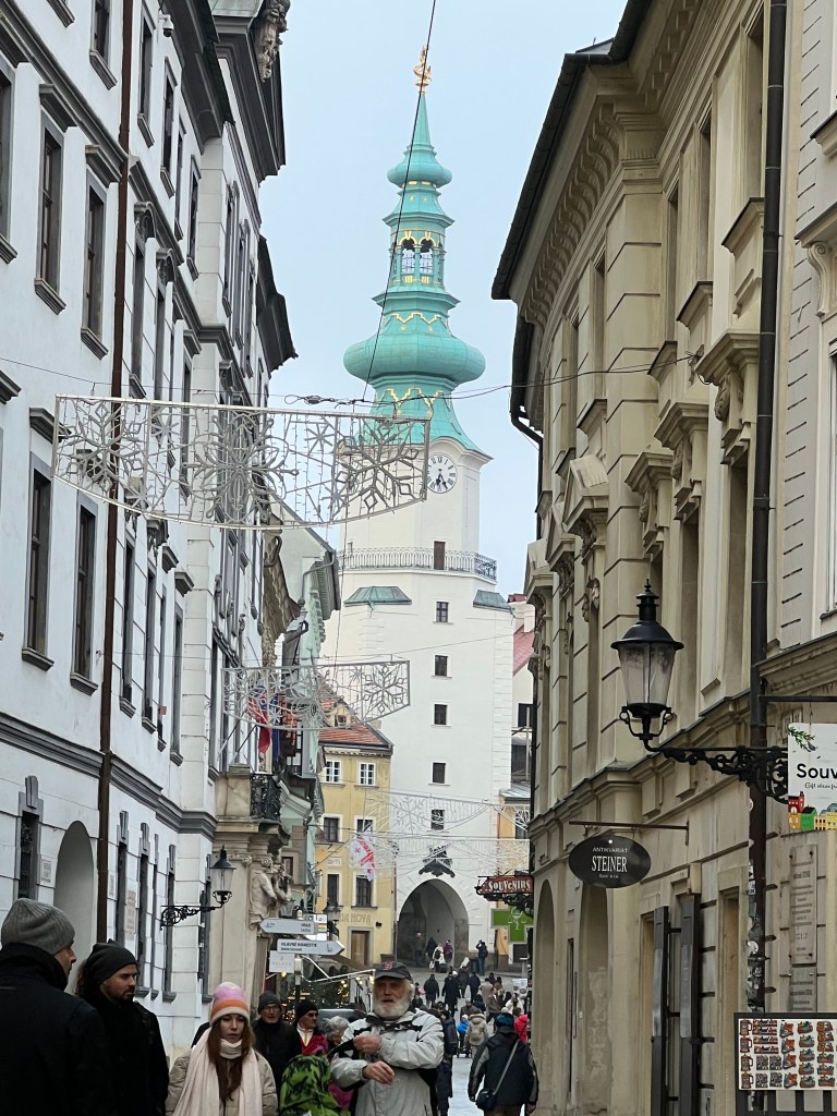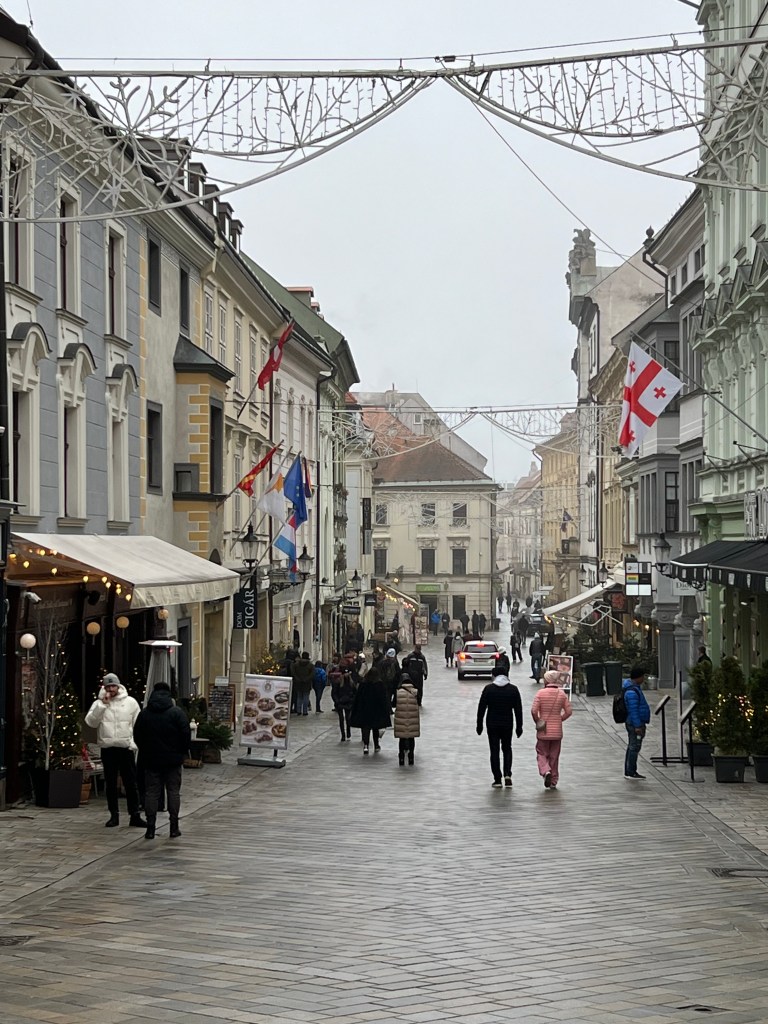 On the 23rd, we took a train to Bratislava, the capital of Slovakia, an hour’s journey. We found the Christmas market had closed the day before and as a result, many shops were closed, since the tourists were gone. It was extremely cold, empty and quite bleak – rather like a 40’s Berlin film noir movie. We discovered the train we rode stopped short of the town and we needed to bus into it. Then we just missed one of the trains going back and had to wait an hour for the next, in a station which was also bleak and cold. It made for a long, tiring day. We’ve a dear friend who loves Bratislava but she went in the summer – quite a different experience. Still, never been to Slovakia. We suspect that it was closed-up and quiet since the Christmas Market had closed. It felt a bit depressed, which added to the somber day. It was a day trip, so we were there maybe four hours with an hour there and back on the train. Left Vienna around 10, got back around 4. And the next day was Christmas eve.