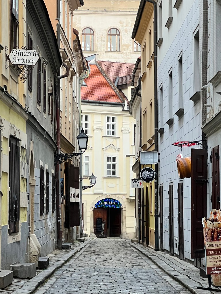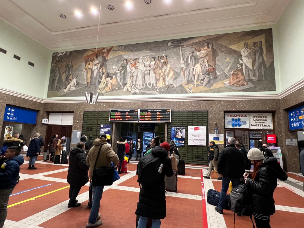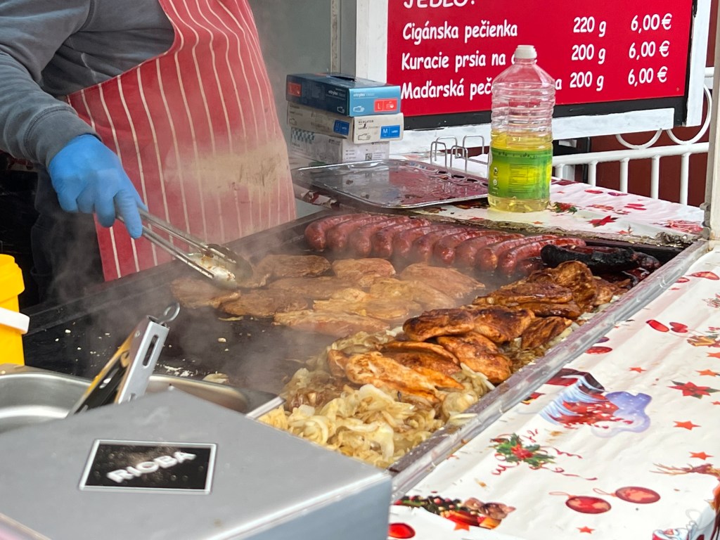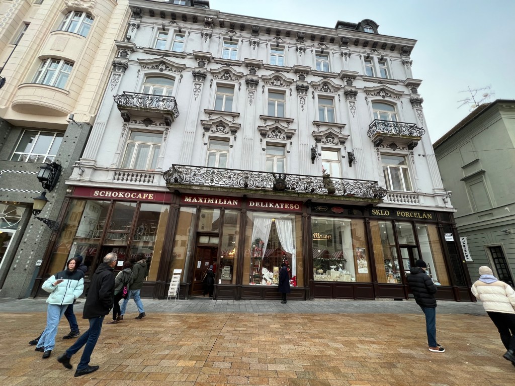 On the 23rd, we took a train to Bratislava, the capital of Slovakia, an hour’s journey. We found the Christmas market had closed the day before and as a result, many shops were closed, since the tourists were gone. It was extremely cold, empty and quite bleak – rather like a 40’s Berlin film noir movie. We discovered the train we rode stopped short of the town and we needed to bus into it. Then we just missed one of the trains going back and had to wait an hour for the next, in a station which was also bleak and cold. It made for a long, tiring day. We’ve a dear friend who loves Bratislava but she went in the summer – quite a different experience. Still, never been to Slovakia. We suspect that it was closed-up and quiet since the Christmas Market had closed. It felt a bit depressed, which added to the somber day. It was a day trip, so we were there maybe four hours with an hour there and back on the train. Left Vienna around 10, got back around 4. And the next day was Christmas eve.