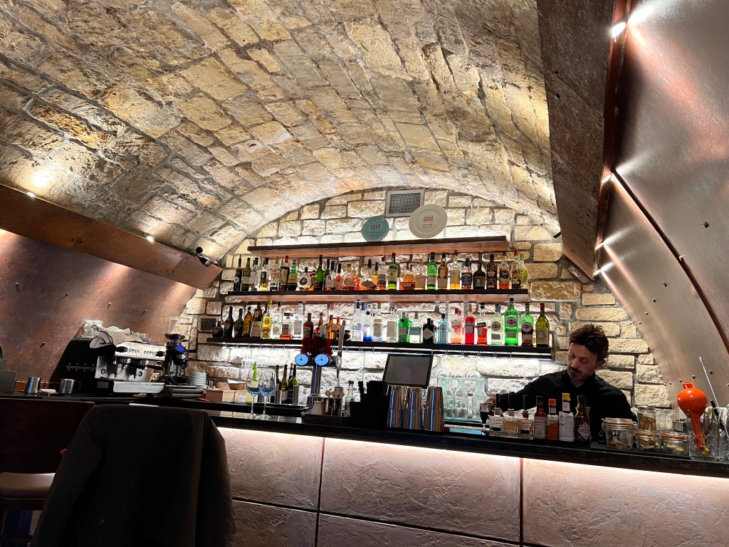 Thoroughly frozen, we took the train back to Bath, napped before dinner – a Spanish tapas place, again in a bricked cellar. They make the best of the small spaces since the buildings are old and small in square footage. Had a great fried potato dish called Patatas Bravas, with an aioli sauce, a flavorful sausage on a soft bread, a baked Manchego cheese with walnuts on toasted baguette and warm Iberian pork slices, medium rare. All delicious and especially when washed down with a jug of Sangria. It all was a bit much and required us to walk a while before returning to the hotel.