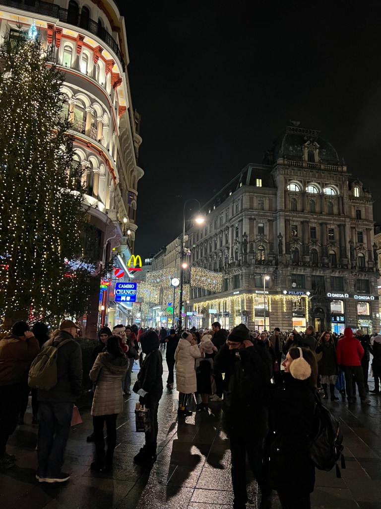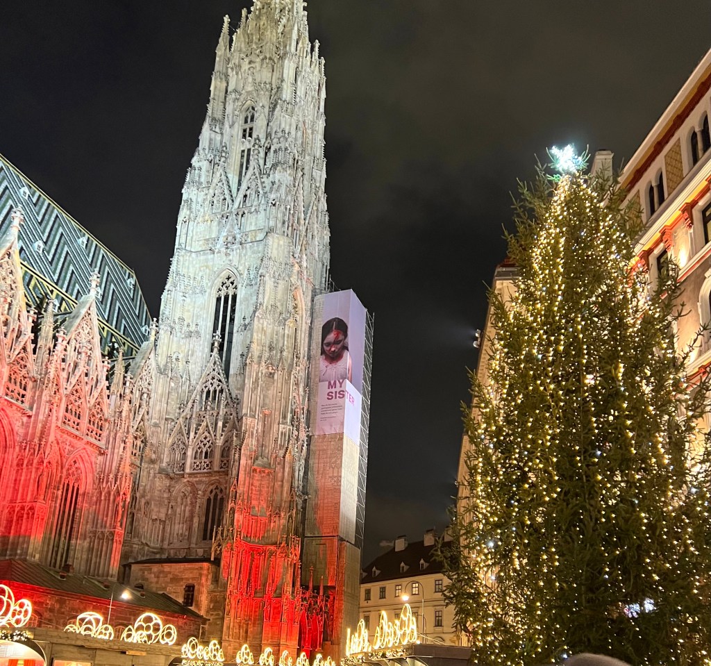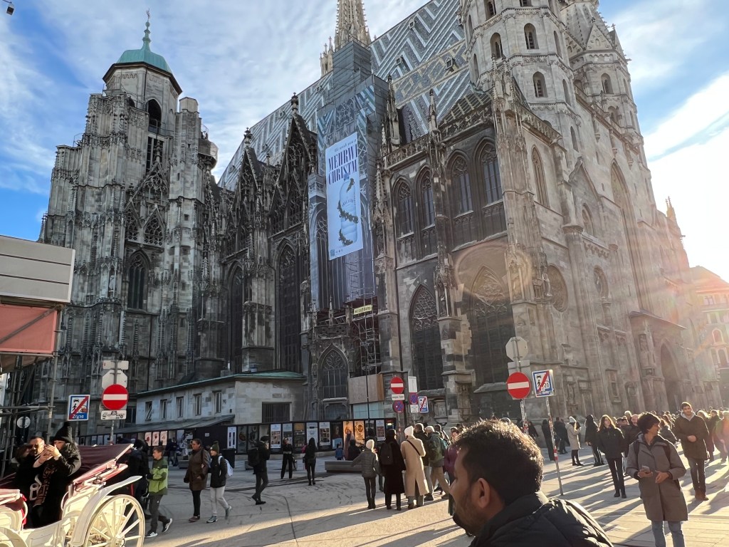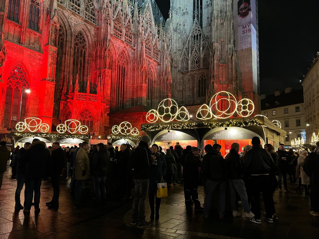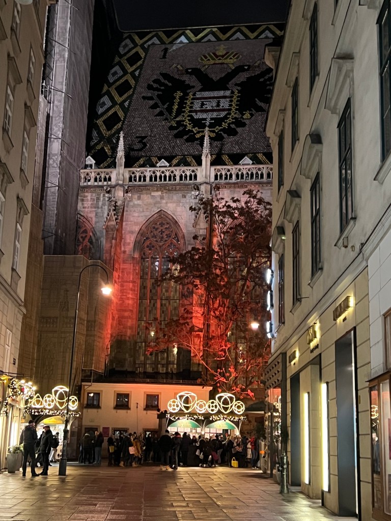 Then we stopped for lunch at a nice, cosy place to warm back up and hit another small market on the way back to the hotel. Napped, relaxed, had some wine and pretty much what amounted to our dinner in appetizers; meatballs, salmon quiche bites, cheeses and cured meats. We braved the cold again to walk to the St. Stephan cathedral, enjoying the lights, the crowds and the stalls. It was beautiful at night and then when we saw it during the day, it was simply magnificent.