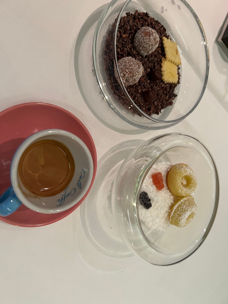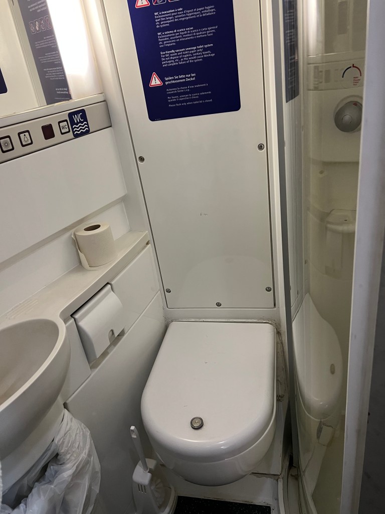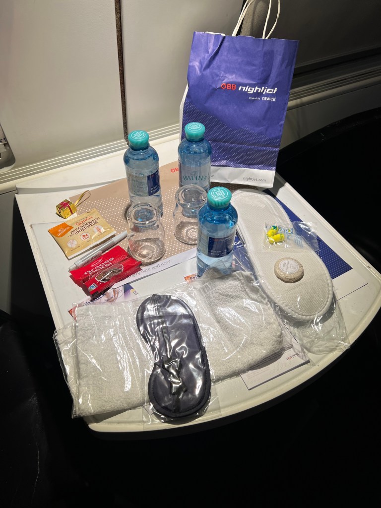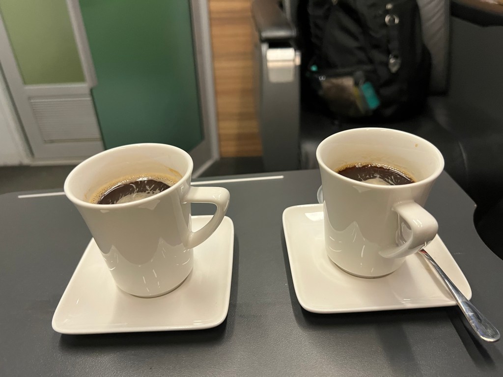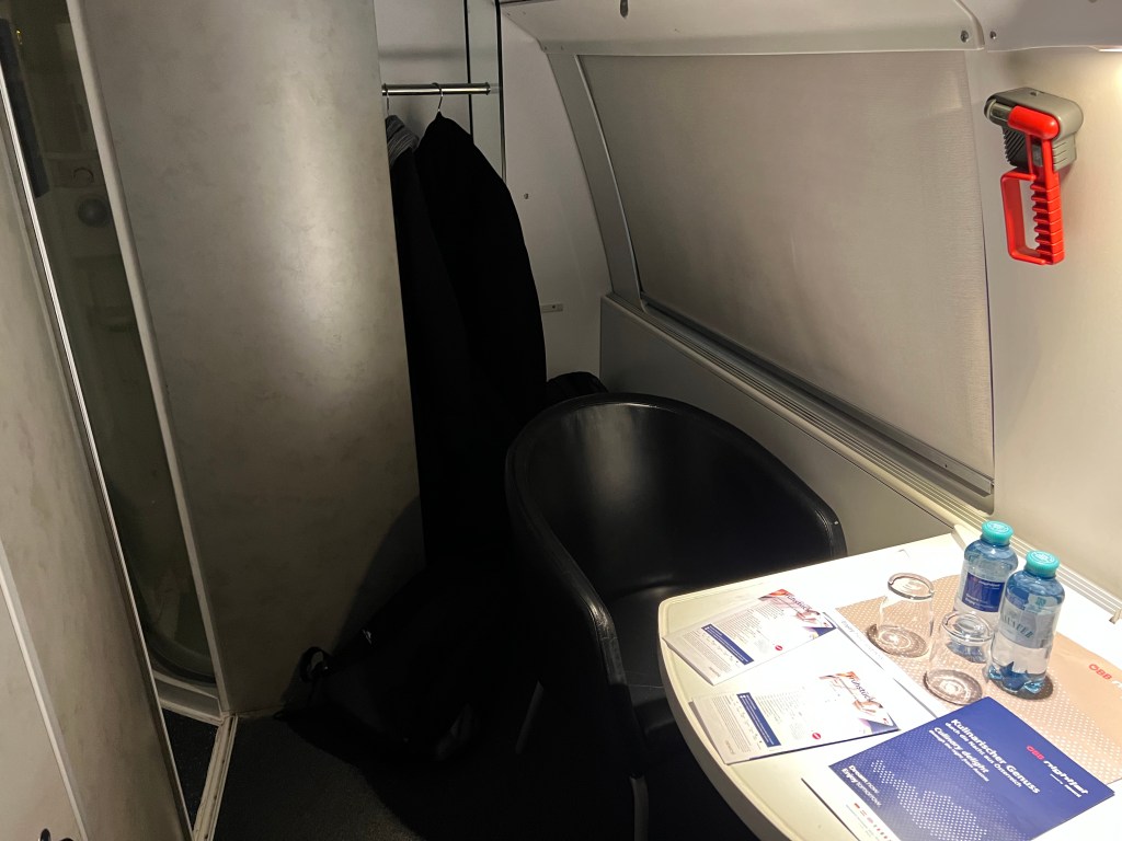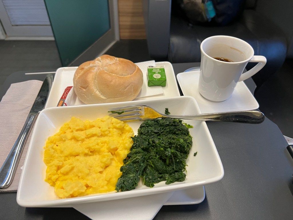 Got in our cabin, got situated and sat down at the table, enjoying the first real food of the day, relaxing. We did make the discovery that there were no charging outlets so we had to turn off our phones to save batteries. The assistant came by to check our tickets and pick up our breakfast choices for the next morning. We spent some time going over the list – each of us choosing different items so we could sample what they had. My sleep wasn’t great because I kept worrying about waking up on time, since without a phone, we had no alarm clock. Sure enough – we woke up when the assistant knocked on the door with the breakfast trays, which meant we had an hour before arrival. Despite our time spent on food choices, we got the exact same thing, a roll with two slices of ham and a slice of cheese. Oh but they did give us the two coffees a piece which we asked for.