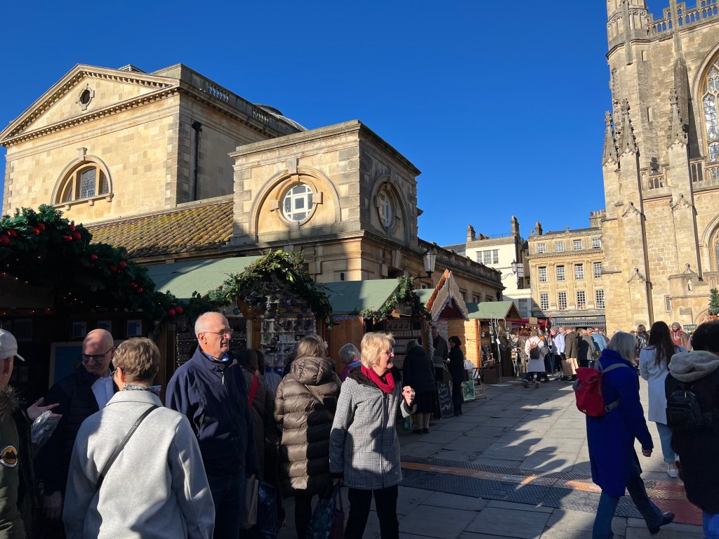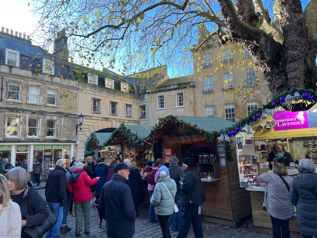 We dropped our bags and went back out to find that the hotel was next to a smaller square which had a Christmas market. There are quite a few Christmas markets in Bath. Since it was a Sunday, they were closing up earlier than usual – other nights they stay open an hour or two more. The restaurant, just a few steps away, was called The Crystal Palace – no idea why – and it was packed, although we were able to get a table as another couple told us they were leaving theirs. We shared a plate of roasted pork loin and a blade of beef. The sides were mashed potatoes with steamed veggies on one and roasted potatoes and veggies on the other. Everything was very tasty – good comfort pub food.