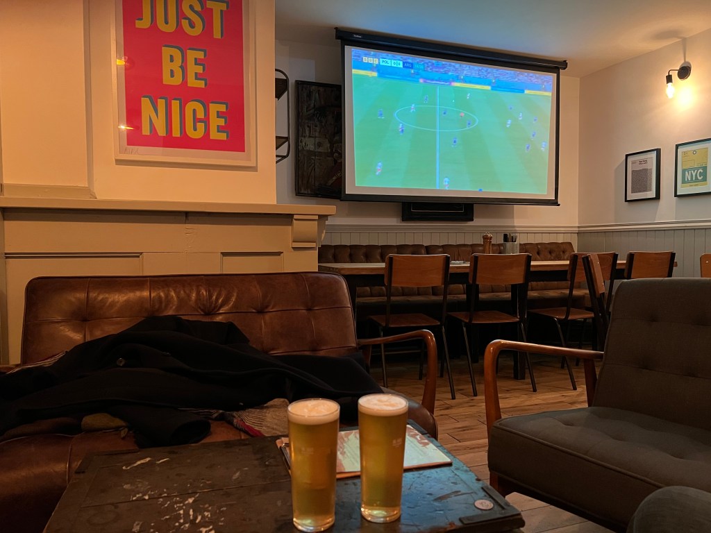 We came across a wonderful bookstore, cozy and warm on a cold night. We love a good bookstore. Also, the world cup craze was in full swing and England won a match during our visit – people were celebrating on the streets. You really have to enjoy the enthusiasm, it’s infectious. On the last night we grabbed dinner at a pub and watched the Polish/Argentina match which was a very good game. Interesting to us that we can tell now which team is dominating the field, not having been soccer (called football) fans before relocating to France. The rules, however, still remain rather complex and confusing to us, especially offsides calls. Using the internet to delve further into the rules, left me with a migraine. We just need a good drinking buddy who will explain the Cliff version of the rules, over a few pints.