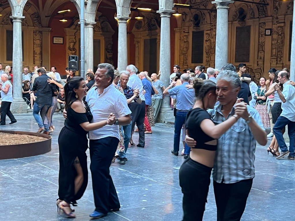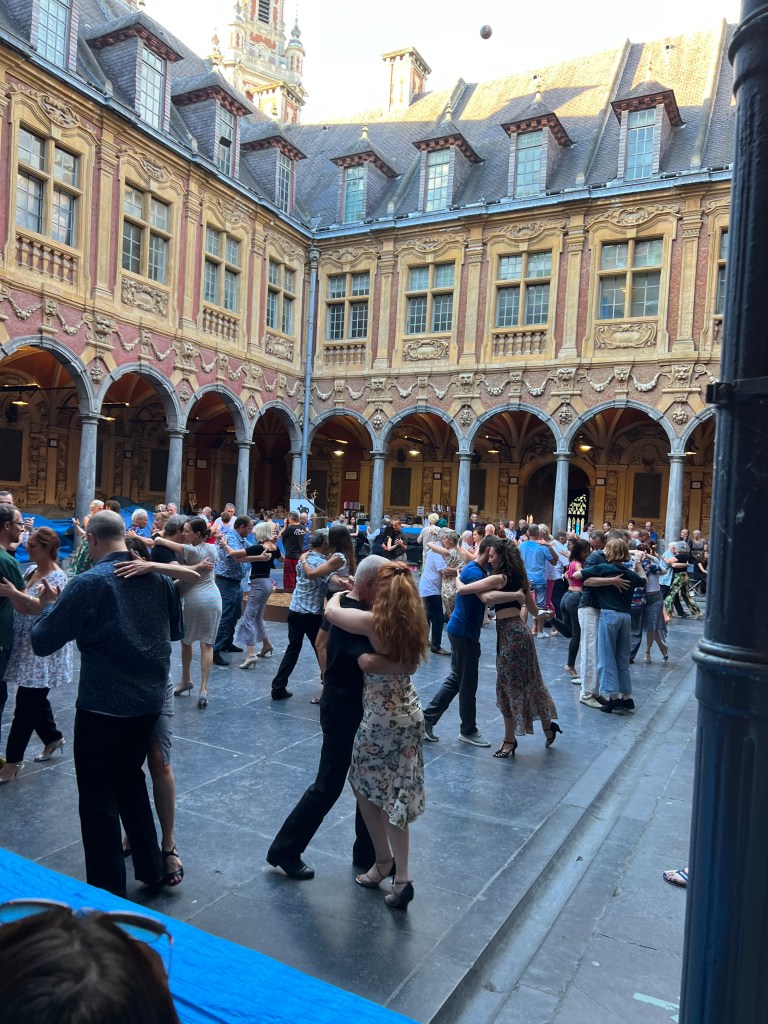 Still no sign of sainthood, so as a reward we walked to the Vieille Bourse, the old stock exchange. On Sunday evenings during the summer, they have tango practice for students in the open courtyard. We have been promising to sign up for lessons but it keeps getting put at the end of our list of ‘to-do’s’. Maybe next year. But it was a lovely evening to watch them.