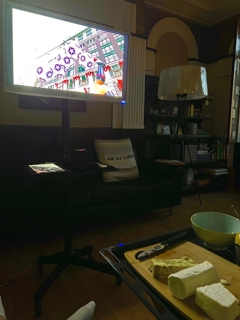 For ourselves, for a Thanksgiving meal, we chose to return to the Le Pot Beaujoulias but for lunch instead of dinner. The third Thursday of every month, they make a veal soup that is popular which we decided to try. It arrived in individual cast iron pots, hot and fragrant. Identified as a veal head’s soup, it contained leeks, carrots, cabbage, potatoes and turnip slices. Of the veal, it contained slices of cheek, tongue and surprising to us, brains. A very flavorful, savory soup but I have to admit that the brains did not contain much of a flavor and what little it did, did not win me over. Still a very hearty, comforting soup which was perfect for the cold day. We toasted to family, friends and the health of all. Later at home, our ‘dinner’ was more of a snack of baguette, ham and cheeses, in our pajamas watching the Macy’s Thanksgiving Day Parade – in great comfort.