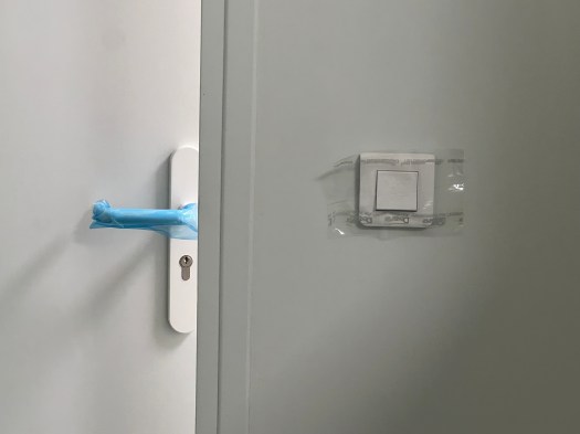 She is a one-person office and the door to her office is off of a narrow hall on the ground floor inside a building which also houses apartments on the upper floors. We have been to her office twice now and the routine is the same. There is a small chair with a box outside the door to which she instructs you to put in your coat, scarf, hat and any bag you’re carrying. When she answers the door she is wearing an apron, a full face mask and gloves which remain in place for the entire visit. She takes the box, shutting you outside the door before returning with a towel, stretched between her two hands. You are instructed to place your health card and payment card in her towel which she then cleans with hand sanitizer. She retreats and returns with hand sanitizer gel that she squirts onto your hands. Only then can you cross the threshold. Inside to your immediate right is a matching small chair that now holds the box you put your belongings in. To your left and after you move further inside, is the office. As you sit in the dental chair, if you look about the office, you see that absolutely everything is covered in plastic; light switches, door handles, calculator, card charging machine, keyboards, etc. The only thing she’s missing is a hazmat suit.