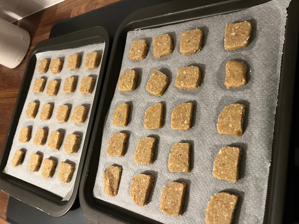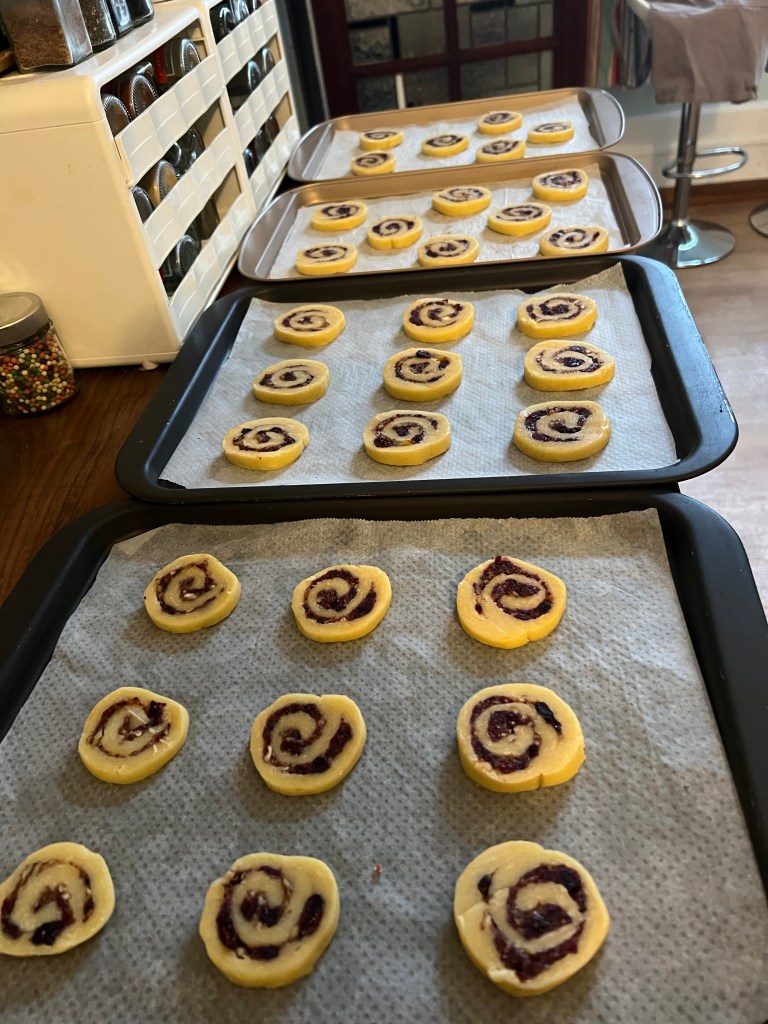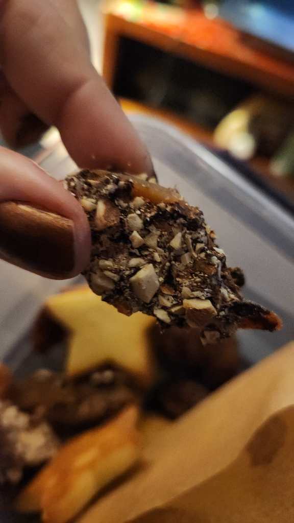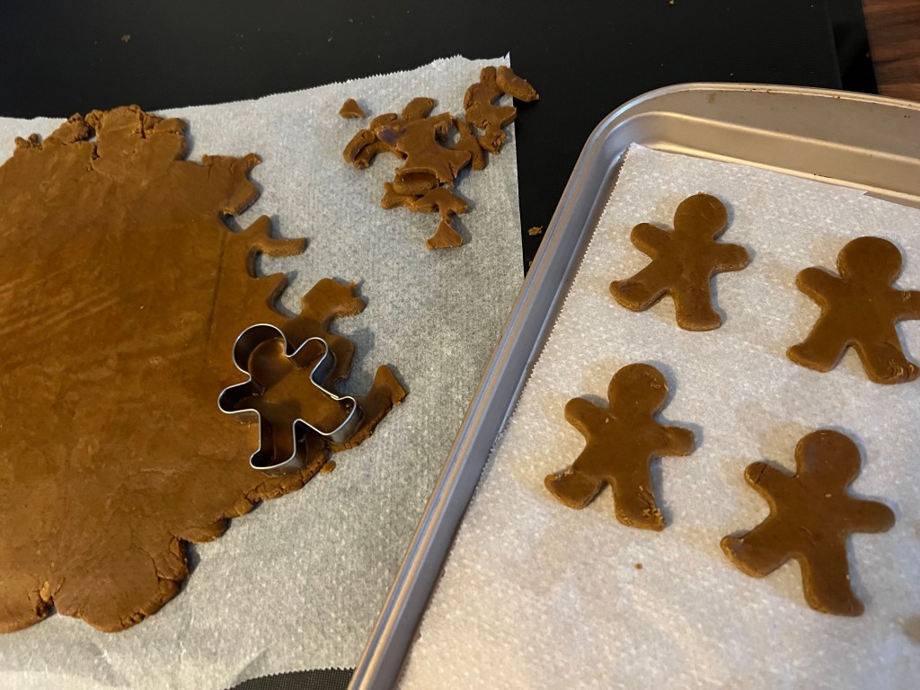 As is our habit, learned from our mothers and grandmothers, G and I readied the kitchen to begin baking treats for friends and neighbors. We made a variety of items to ensure that something in the gift boxes would appeal to everyone. This year’s picks were; cranberry spirals, gingerbread men, star sugar cookies, hazelnut squares, carmelized nuts, chocolate almond toffee, dark chocolate fudge and almond stuffed, honey drenched dates.