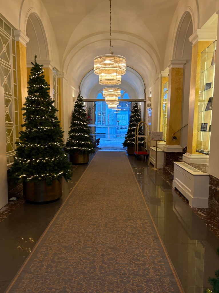 Time to jump into the holiday season. And wow – after last month, this one was quite a switch in gears. Out came the decorations and our tree, an all-natural branched marvel that we found during our first year here. It swivels from a flat stance to a three dimensional replicate of a four foot tree. We add cut boughs to the arms to lend some additional color. The front hall was decked in miniature lights and stars, our balcony with holly garland and lights, but we held off decorating the tree until our friends, Caren and Bret, joined us. The lights on our tree are left on the entire month so people from the street below can enjoy it as well.