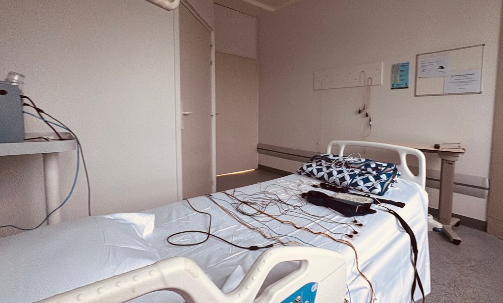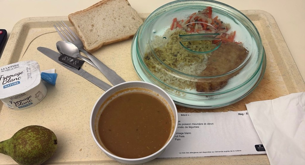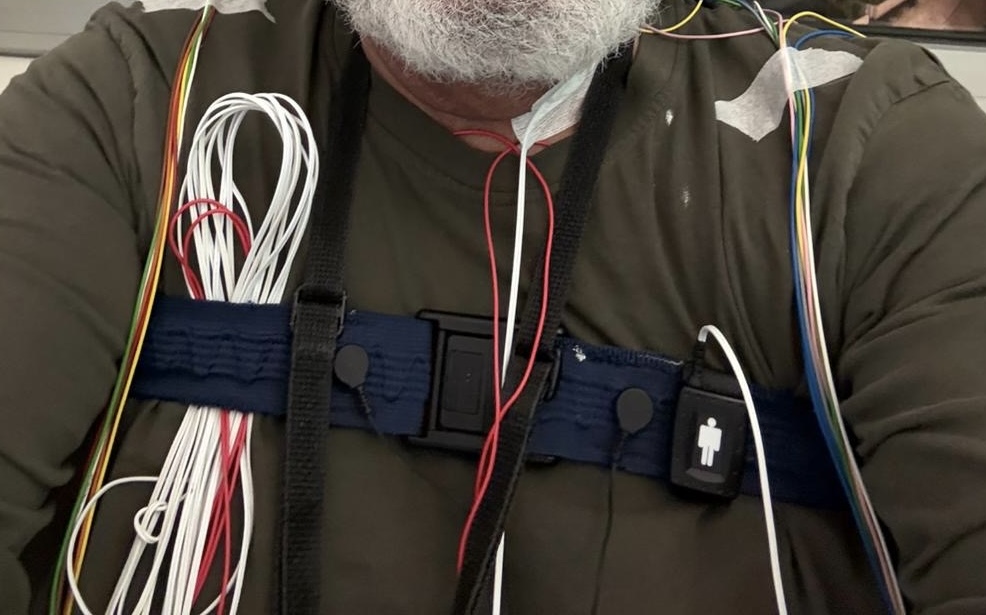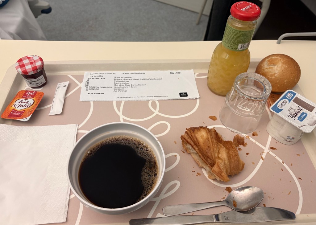 Next on the agenda was G going to a sleep apnea study overnight at a nearby hospital. Good news is he doesn’t have it and better news, they fed him dinner and then breakfast the following morning. He sent pictures of all the wires and probes on the bed that they stuck all over him and the meals he was served. He said the coffee was great!