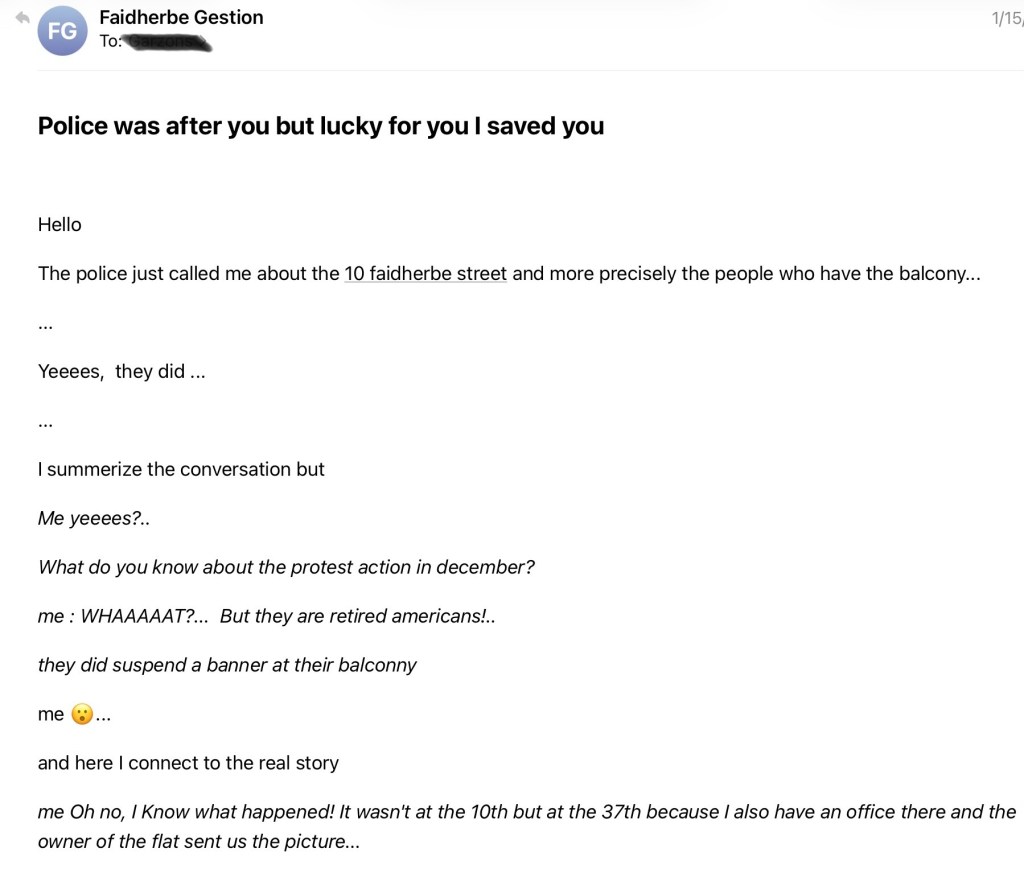 It’s amazing how quickly your brain processes some things. My heart stopped, several scenarios flashed before my eyes – visa revoked, savings depleted for a lawyer for the court case, losing said court case, spending time behind bars. Oh, yes. My brain may move as fast as a three-legged ant when it comes to learning French but it took off like the Roadrunner in a Wile-E-Coyote cartoon, faced with the threat of a police arrest. Opening the email, we have this image: