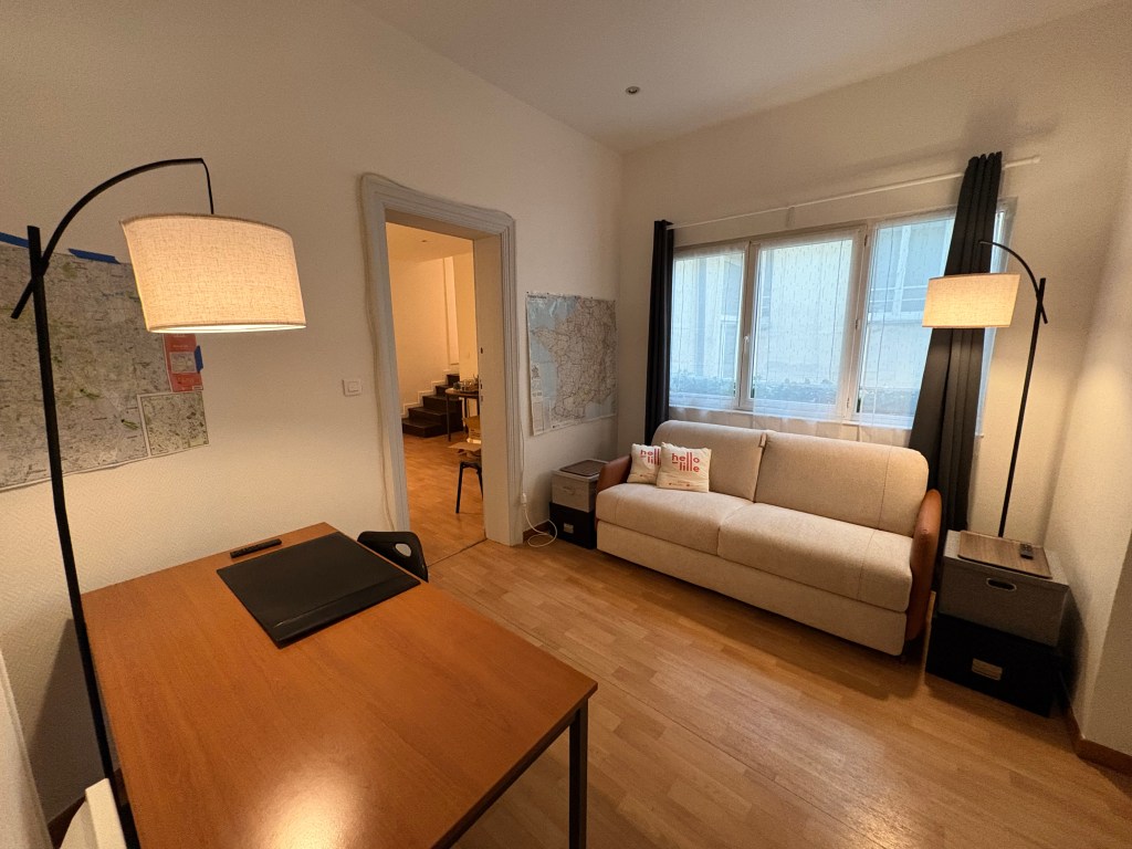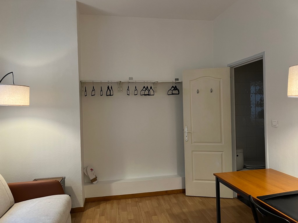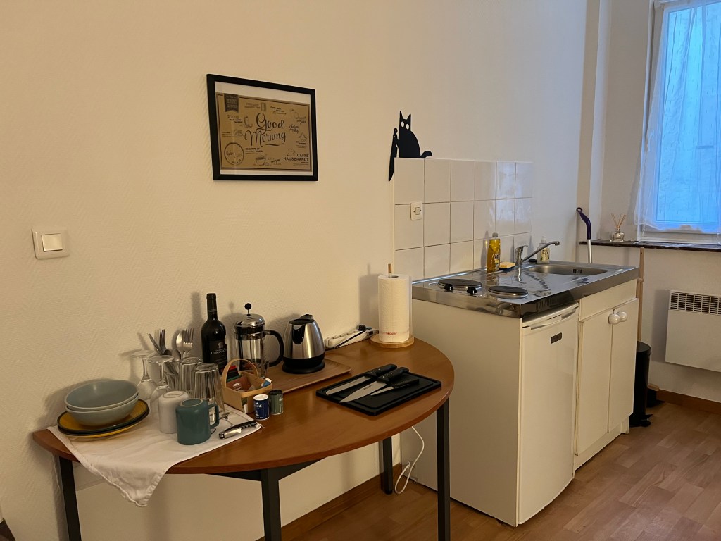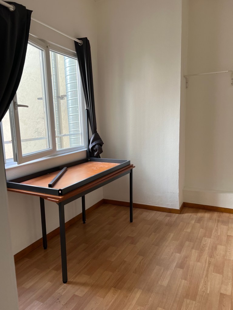 We turned our attention to getting the next door studio up to some decent quality for incoming February visitors. The windows, we had already covered in gauze curtain panels and tied silk faux ivy to the outside bars, to hide the incredibly ugly view of the outside vents covered in pigeon droppings. But the windows had privacy curtains from the previous occupant that hung 2 feet longer than needed, heaped, dragging on the floor. A quick iron on hemming tape took care of that issue. G also put up a shelf over the sparse clothes rack for the bed linens. Stick on towel hooks went in the bathroom, a clock and a couple of art pieces went in the kitchen which was then outfitted with the bare minimum of cookware, utensils, plates and an electric teapot – oh and the all important wine opener. Certainly not the Ritz but a bit more welcoming than a Motel 6. Lastly I stuck a prominent note warning guests that the bedroom had NO privacy – all can be easily seen from the adjacent apartments, including the bathroom, which is why the previous tenant threw on privacy curtains in haste which were 2 feet too long. He did that (I’m speculating here) after I informed Fabrice that he might want to let the tenant know we could see him running around nude, including toilet trips. No one wants to see that and we were sure he didn’t want to show it either. The curtains went up one day after I passed that information on to Fabrice. So, back to the studio, the addition of teas, wine, cheeses in the fridge and ice in the freezer, we were ready. Some before and after shots follow.