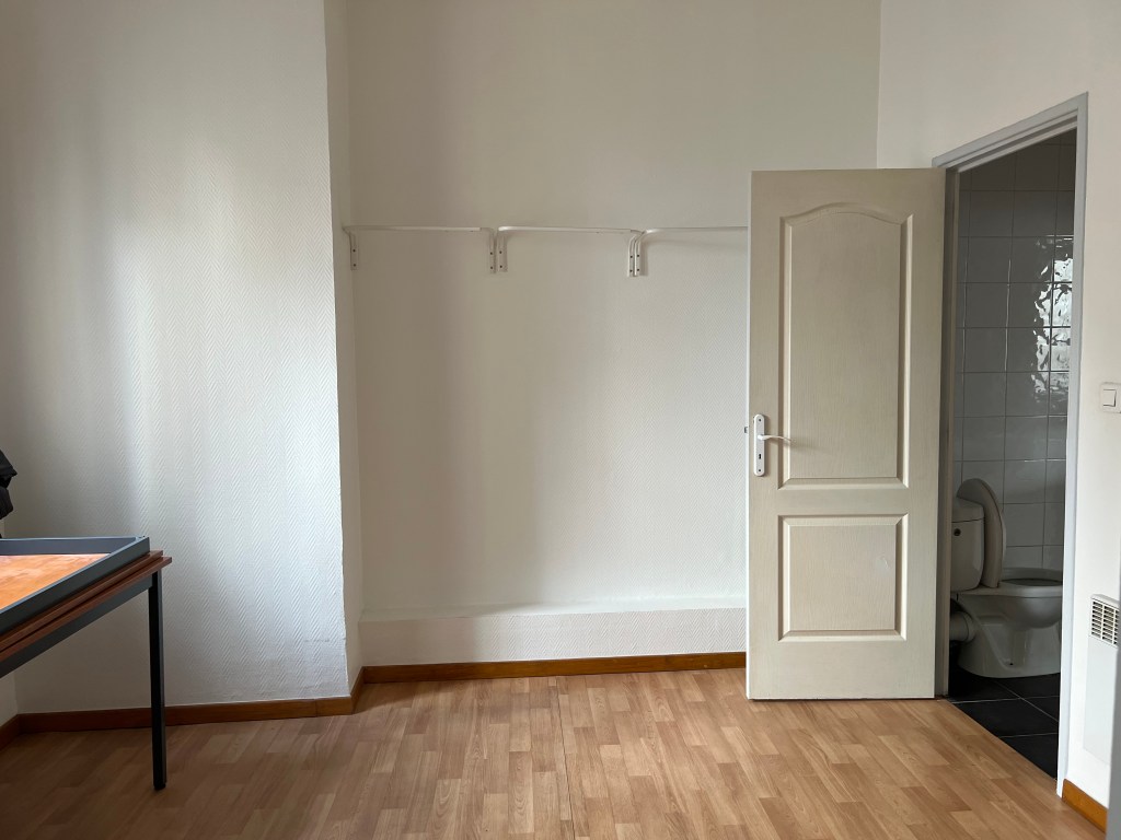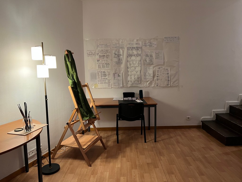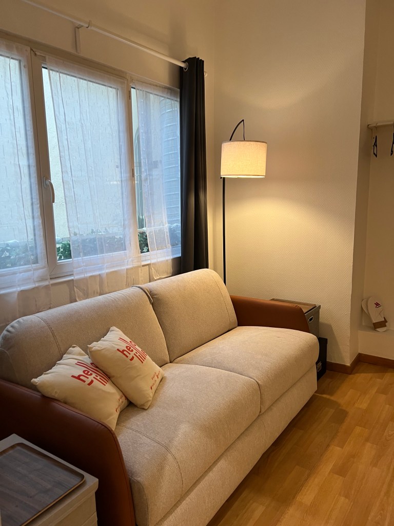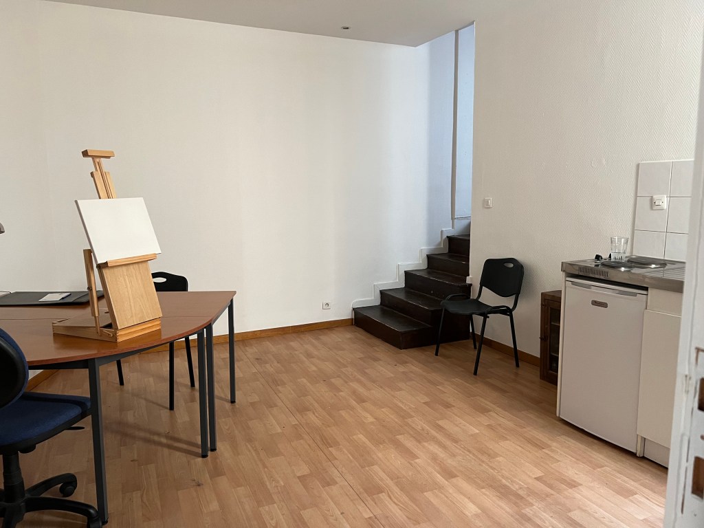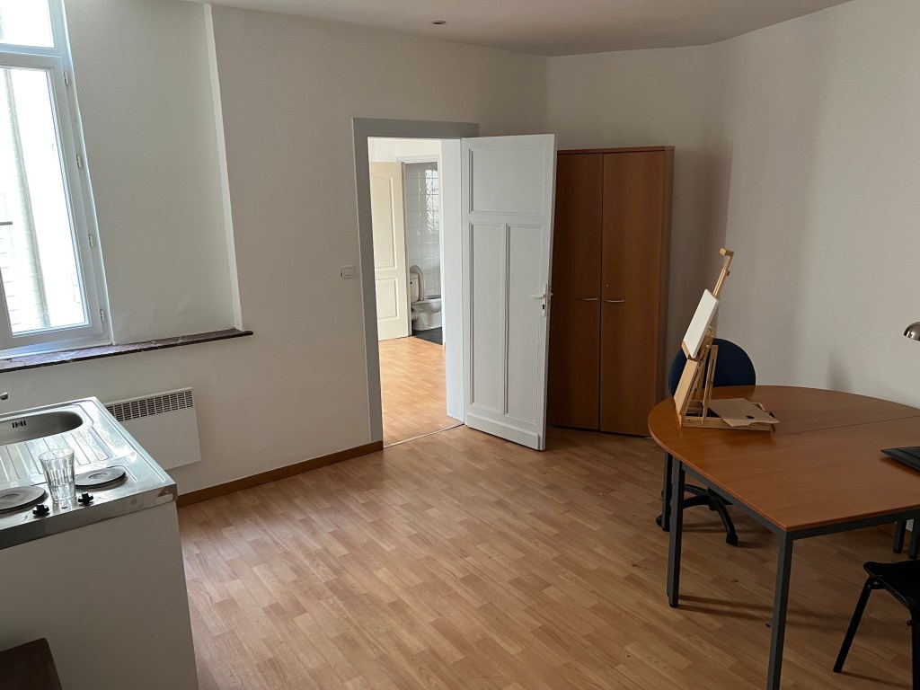 We turned our attention to getting the next door studio up to some decent quality for incoming February visitors. The windows, we had already covered in gauze curtain panels and tied silk faux ivy to the outside bars, to hide the incredibly ugly view of the outside vents covered in pigeon droppings. But the windows had privacy curtains from the previous occupant that hung 2 feet longer than needed, heaped, dragging on the floor. A quick iron on hemming tape took care of that issue. G also put up a shelf over the sparse clothes rack for the bed linens. Stick on towel hooks went in the bathroom, a clock and a couple of art pieces went in the kitchen which was then outfitted with the bare minimum of cookware, utensils, plates and an electric teapot – oh and the all important wine opener. Certainly not the Ritz but a bit more welcoming than a Motel 6. Lastly I stuck a prominent note warning guests that the bedroom had NO privacy – all can be easily seen from the adjacent apartments, including the bathroom, which is why the previous tenant threw on privacy curtains in haste which were 2 feet too long. He did that (I’m speculating here) after I informed Fabrice that he might want to let the tenant know we could see him running around nude, including toilet trips. No one wants to see that and we were sure he didn’t want to show it either. The curtains went up one day after I passed that information on to Fabrice. So, back to the studio, the addition of teas, wine, cheeses in the fridge and ice in the freezer, we were ready. Some before and after shots follow.