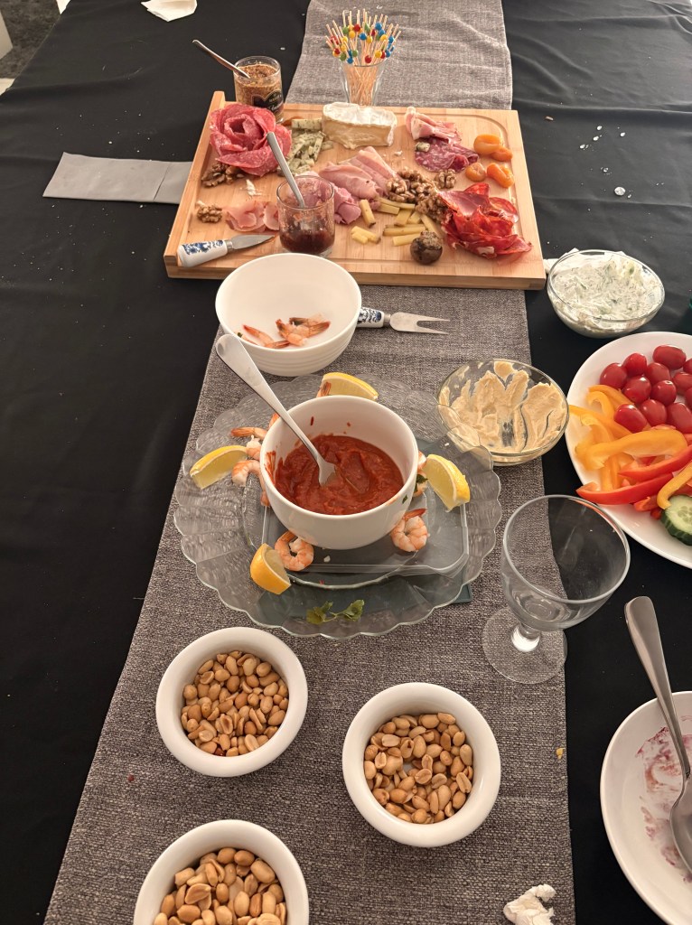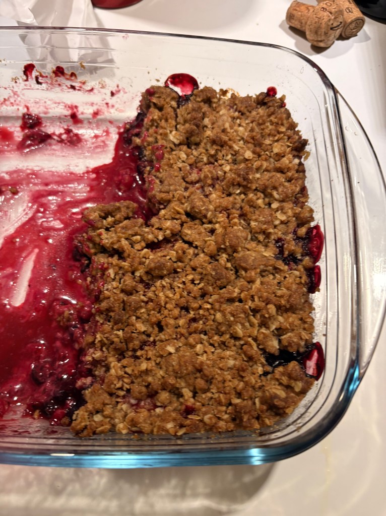 Finally on the 30th, we were treated to a wonderful dinner party held by Bret and Caren and six other guests. With the variety resulting in a delightful blend of Spanish, French and English conversation that included one and all. There was enough food to feed the Ottoman Empire starting with an endless charcuterie palette of meats, nuts, cheeses and fresh vegetables. There was a wonderful large shrimp cocktail bowl, stuffed garlicky mushroom caps and a brocolli cheddar soup with salt & pepper baguette. We’re just sorry not to think of taking pictures of the huge menu until after we’d decimated most of the food but I snuck in a sad picture of the remains of a mixed-berry crumble that was served with vanilla ice cream – (which like all of it was utterly delicious – trust me if there’d been any more room, that would have been gone too) and then one shot of the group as it was winding down with the last glass of wine. We went home happily satiated. It was a wonderful evening to end the cold, grey month !