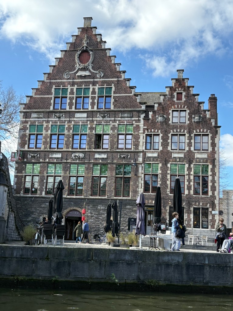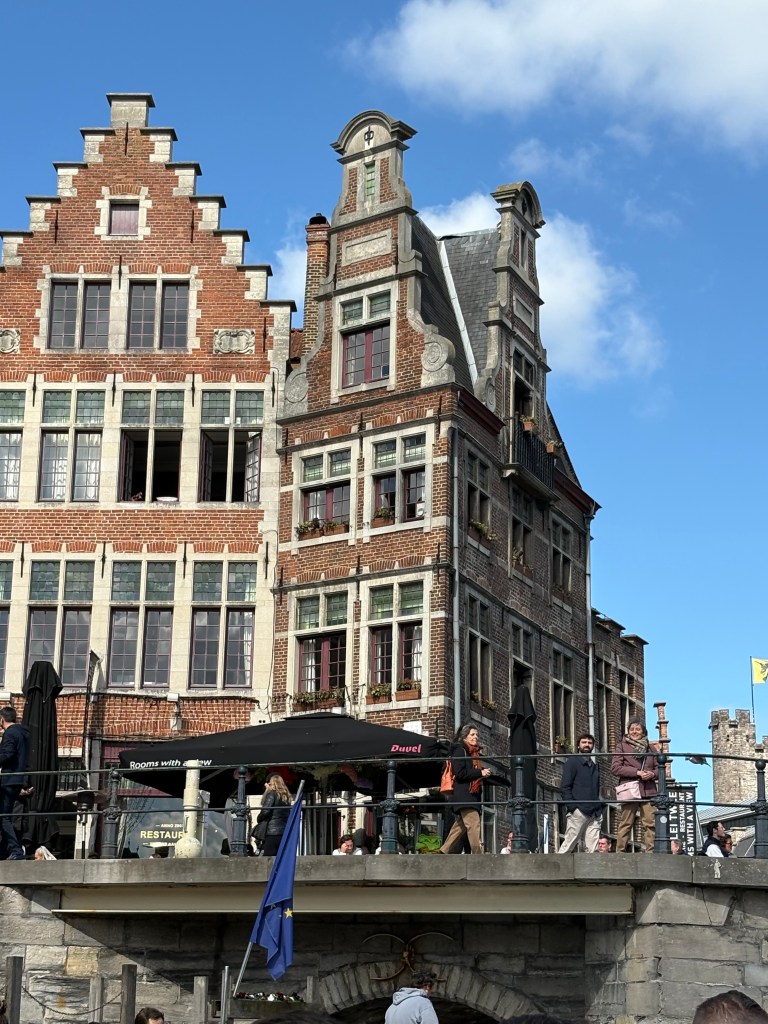 Next day was Ghent and the weather was perfect. Ghent has at least two train stations and two different paths to get into town, as I was to discover. The first time we went to Ghent, the walk was through gardens, along waterways and entered into through a picturesque architectural scene, which is what I had described to them. The second one, which we used this time, is the city main street, lined with modern buildings. Quite different, in fact making me doubt my memory from the first visit. In any case they were both enchanted with the lovely town as we explored it.