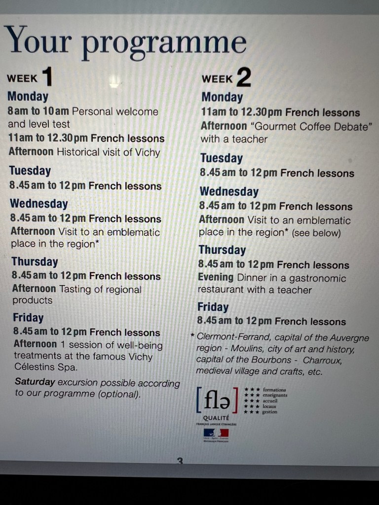 The last was an immersion program for seniors (50+), run by Alliance Française. A two week program, you travel to Vichy – staying in a choice of three types of living arrangements; a host home, a flat equipped with a kitchen or a hotel. The days are outlined by 3 hour class, a break for lunch and an afternoon outing in town for history, food shopping or entertainment: www.cavilam.com/programme-premium-senior/