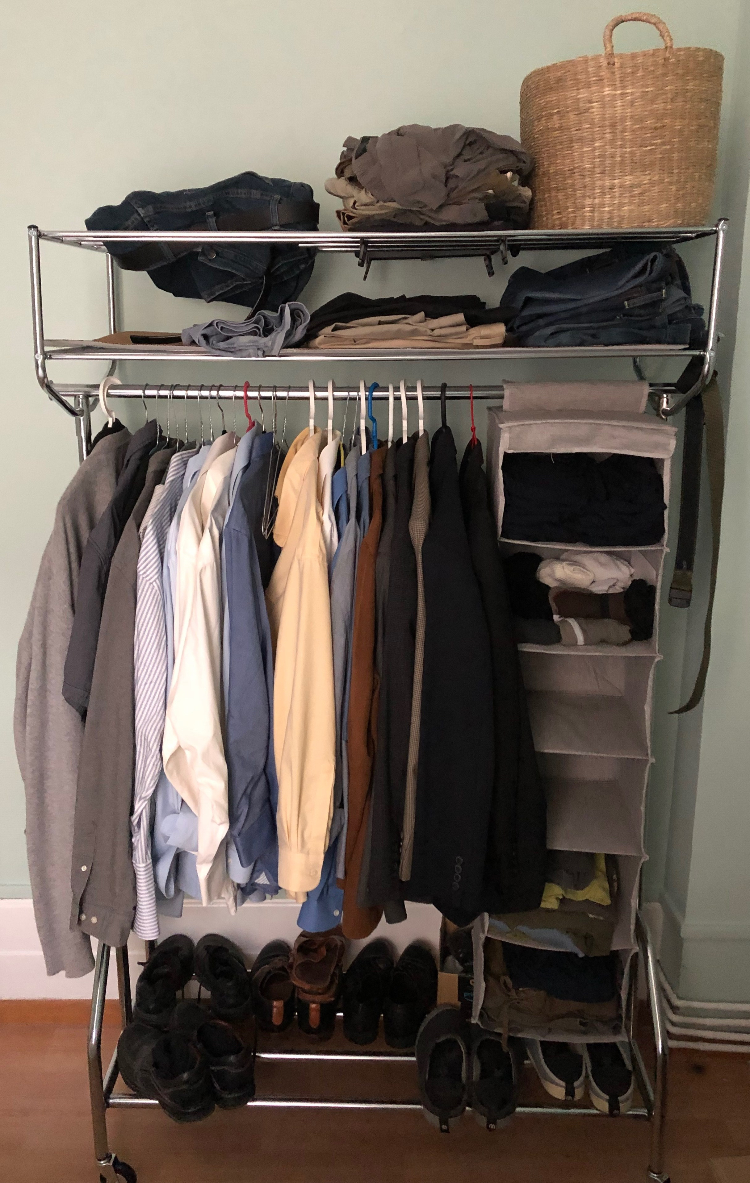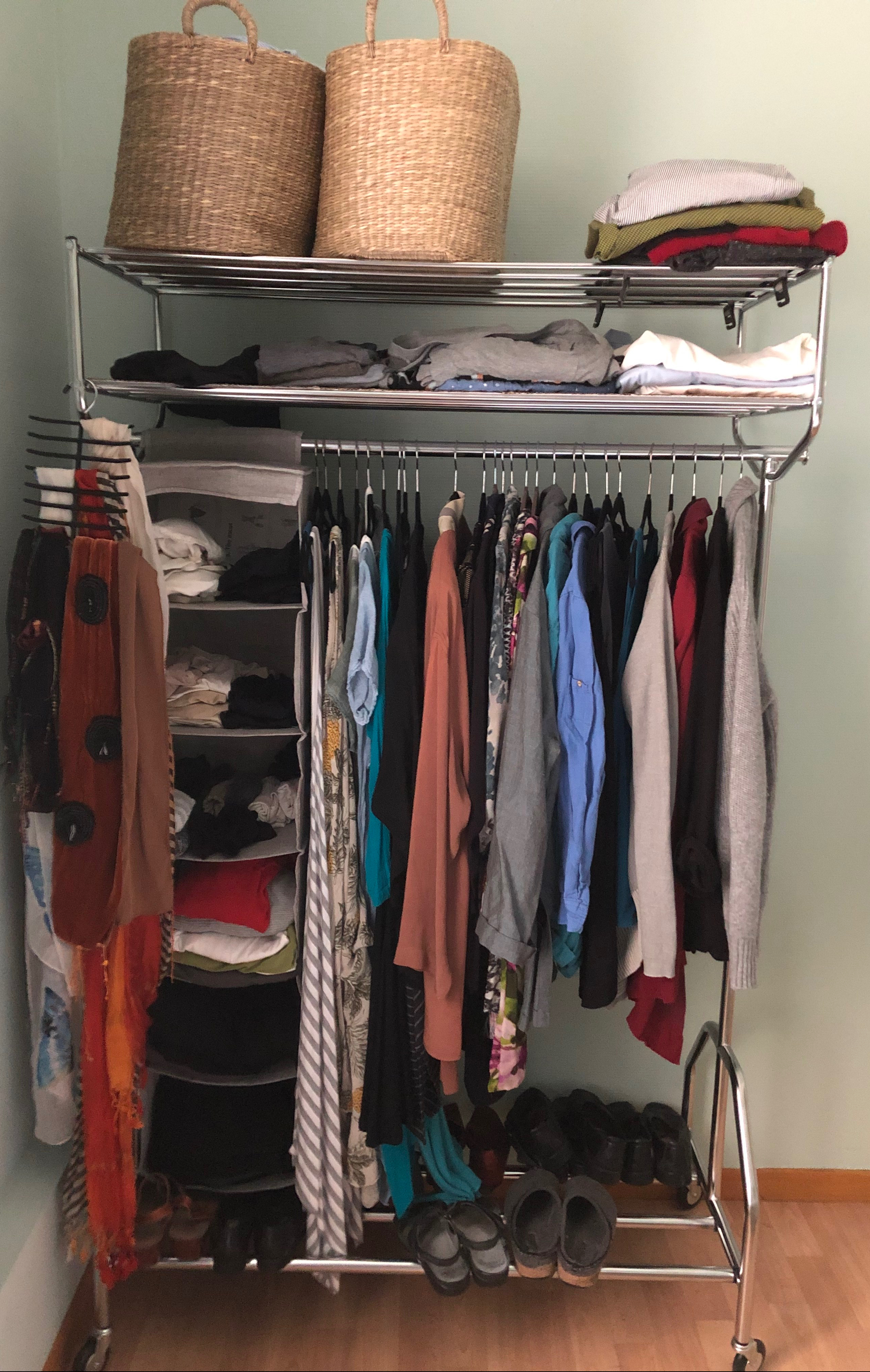 Besides spending the month organizing our space (and it still continues), we ran back and forth to a variety of stores for hardware, office supplies and such. We chose wardrobe racks rather than armoires because of the size of the bedrooms and the additional issue of getting them up to the 3rd floor. Also, huge cabinets would really make the rooms feel small.