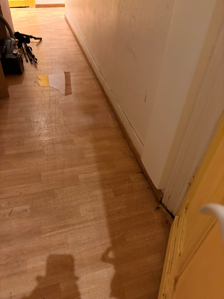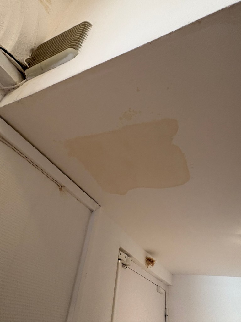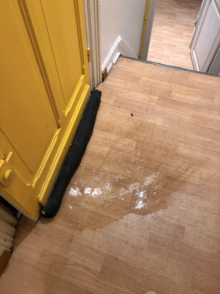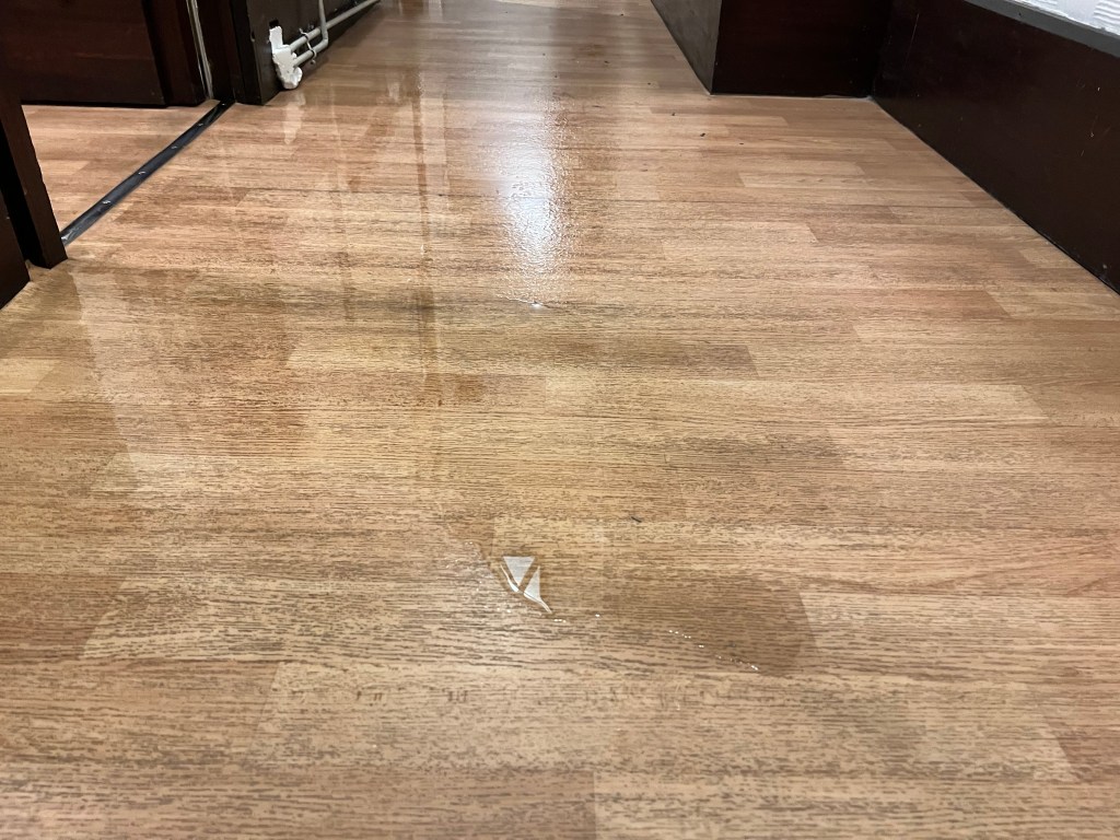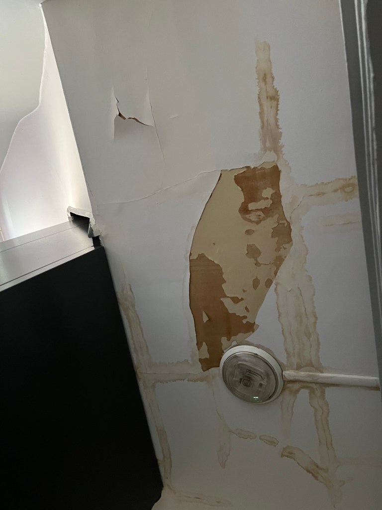 Once he returned, he reported to me that he banged on their door to no avail and then let himself in, yelling “Anyone Home?!!”. Also no answer but now he was standing deep in water and the bathroom sink faucet was running full on, filling the sink, the floor and the hall. He took pictures, turned off the faucet and calling out again, left the apartment to return downstairs. We spent the next hour cleaning up our place and in hindsight we should have gone back up to mop out their apartment but we didn’t even think of it as we trudged back to bed. It might have saved us some further wall and ceiling damage.