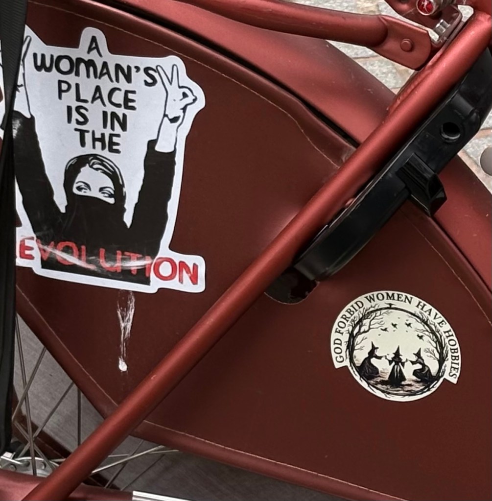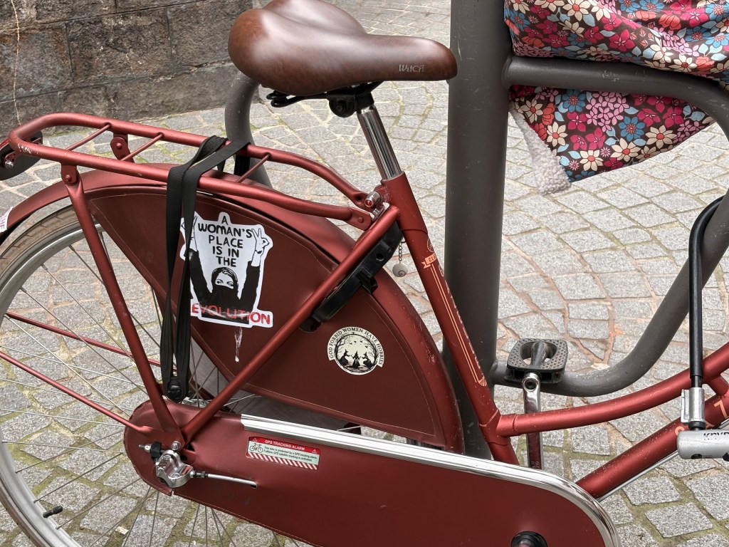This month also marked International Women’s Day on March 8. People are urged to join marches in some 150 towns – including Paris, Bordeaux, Lille and Marseille as well as smaller places such as Saint-Malo – to mark International Women’s Day. It aims to provide a platform in the women’s rights movement, bringing attention to topics such as gender equality, reproductive choice, and violence towards women. Here in Lille it was good to see so many families out on the march. And, I caught a photo of a bike that was great from both sides. I missed getting the “R” in revolution in the photo and I loved the decal.
