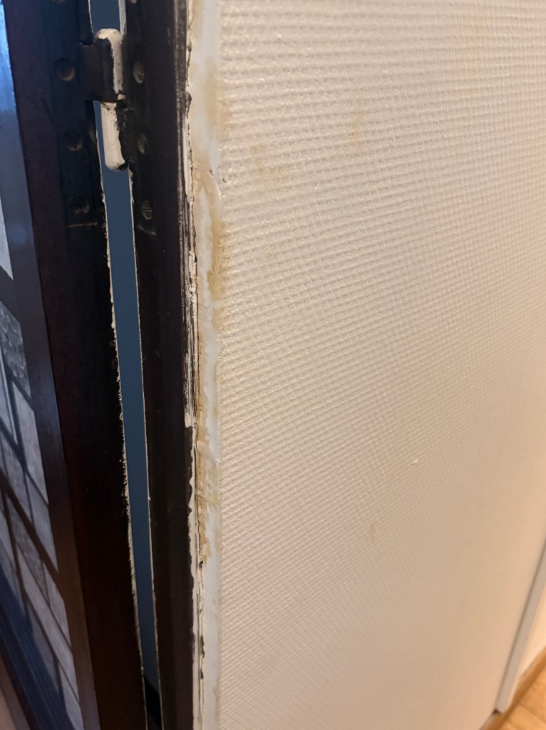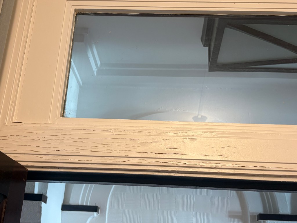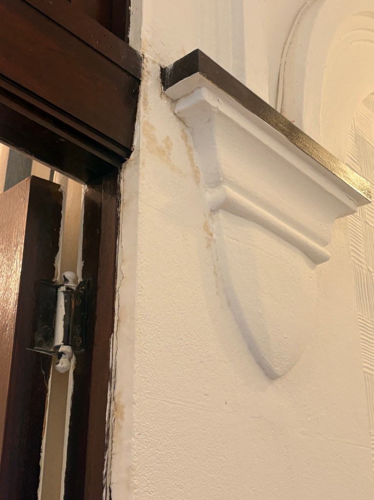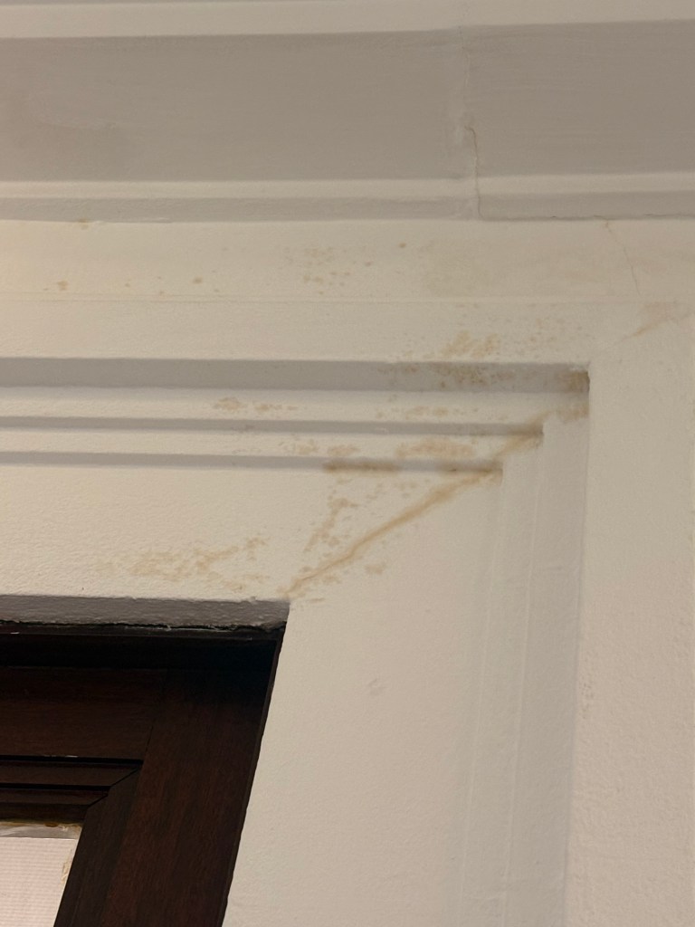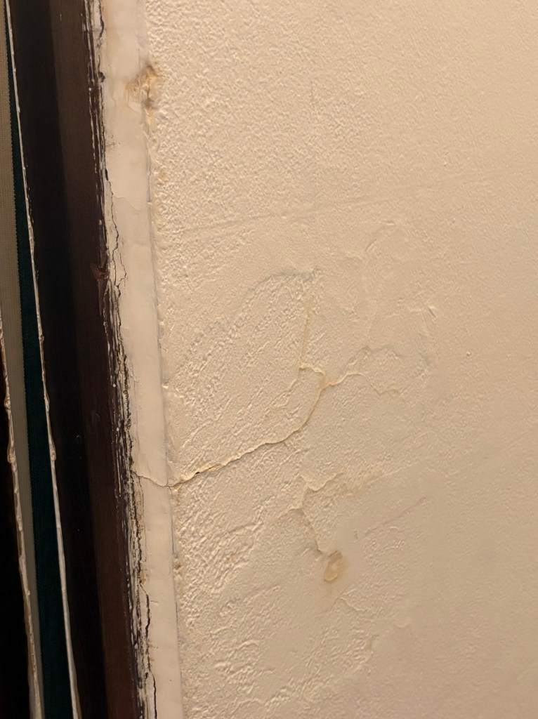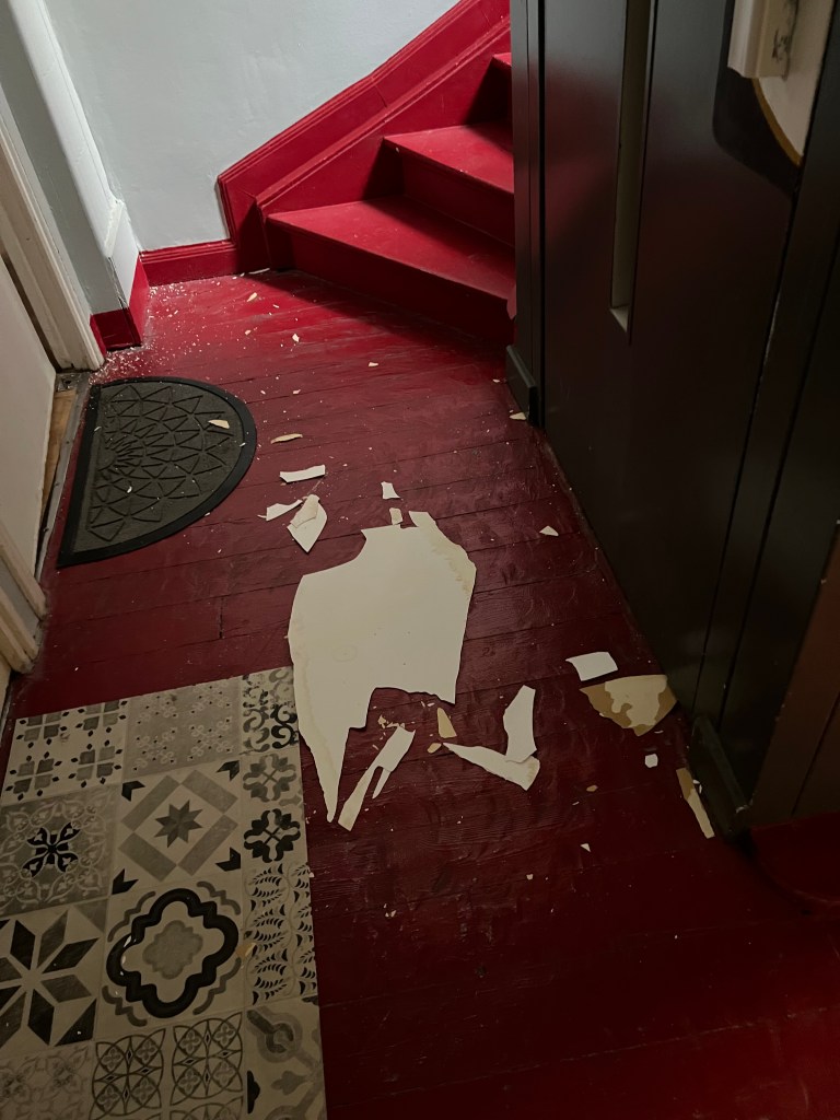 Apartment insurance is required for each tenant. Our landlord came to help us fill out the forms to submit. Two of the four upstairs apologized profusely, the other two we have yet to see. All doors along that wall are swollen and unable to shut, which include our office, the W/C and alas, our front door. We have been forcing it shut in order to lock it but it will need repairing the most because of that. The wall is cracked in several places, water stains are abundant on the wall as well as the ceiling and plaster is starting to flake off. In the hall outside our door, chunks of the ceiling have fallen and the electricity cut to the ceiling light as well as the elevator button.
